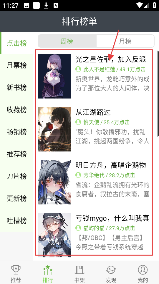 1、在排行页面的周榜里,有《光之星佐菲,加入反派聊天群》等热门小说,点击就能进入详情页哦。
