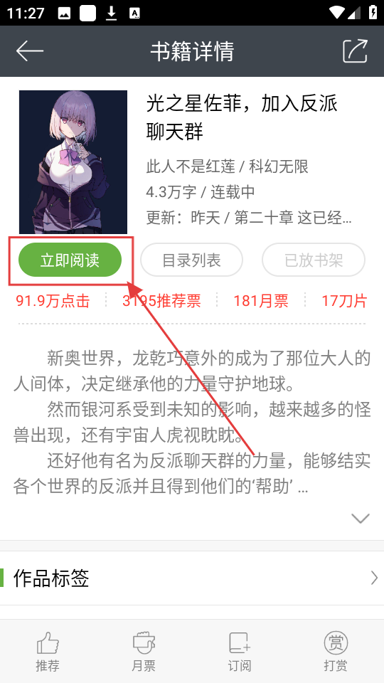 2、进入小说详情页后,点击【立即阅读】,就能开始阅读这本小说啦。