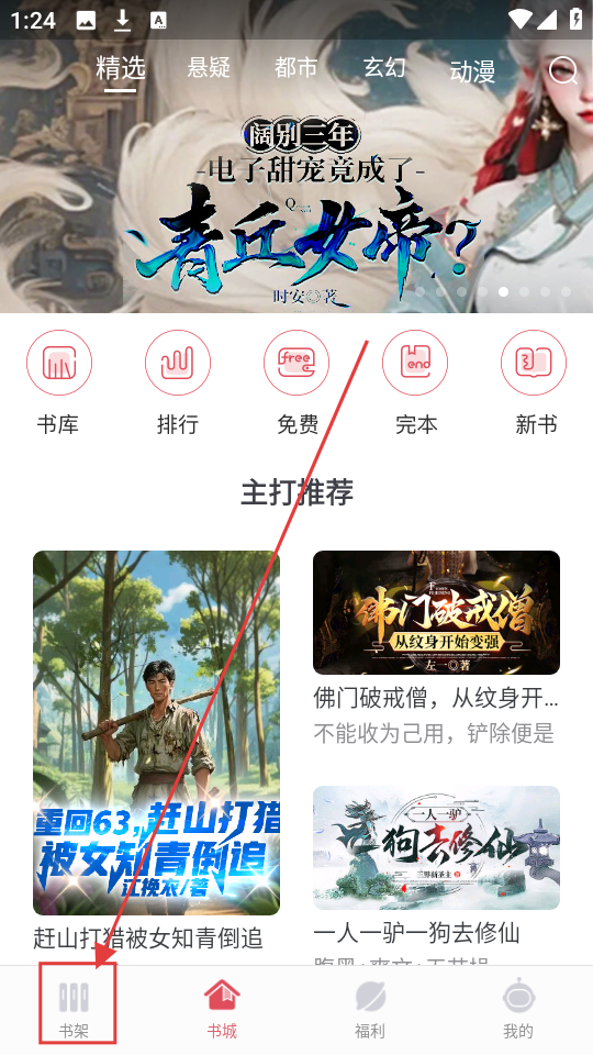 1、想管理书架的话,先点击底部【书架】,进入书架页面,开启后续操作吧。