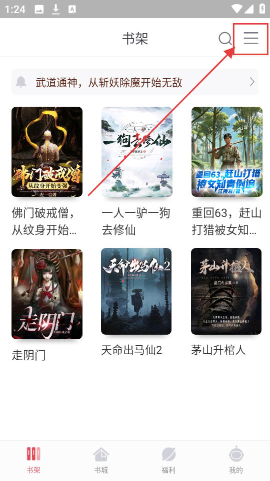 2、在书架页面,点击右上角的三条杠图标,就能展开功能菜单,超方便的哟。