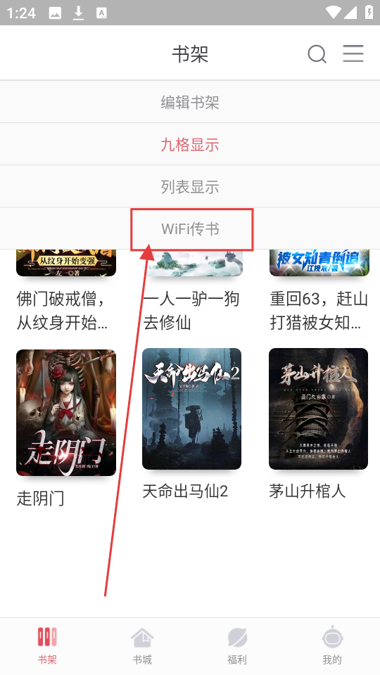 3、展开菜单后,选择【WiFi传书】,就能开始传书操作,轻松把书传到手机啦。