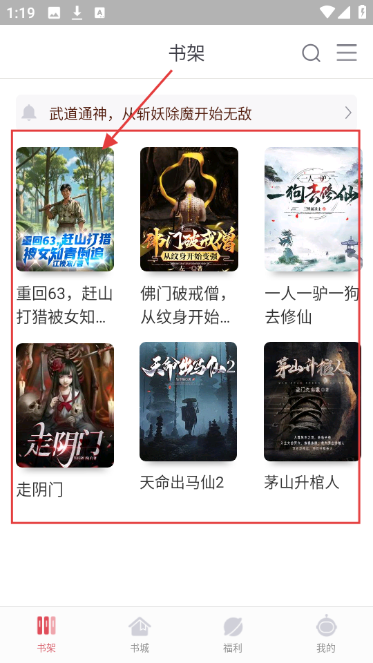 1、在书架找到《一人一驴一狗去修仙》,点击它就能开始阅读啦。