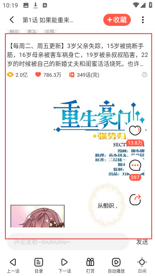 4、进入漫画阅读页面后,就能继续阅读啦,还能对漫画进行收藏、评论等操作哦。