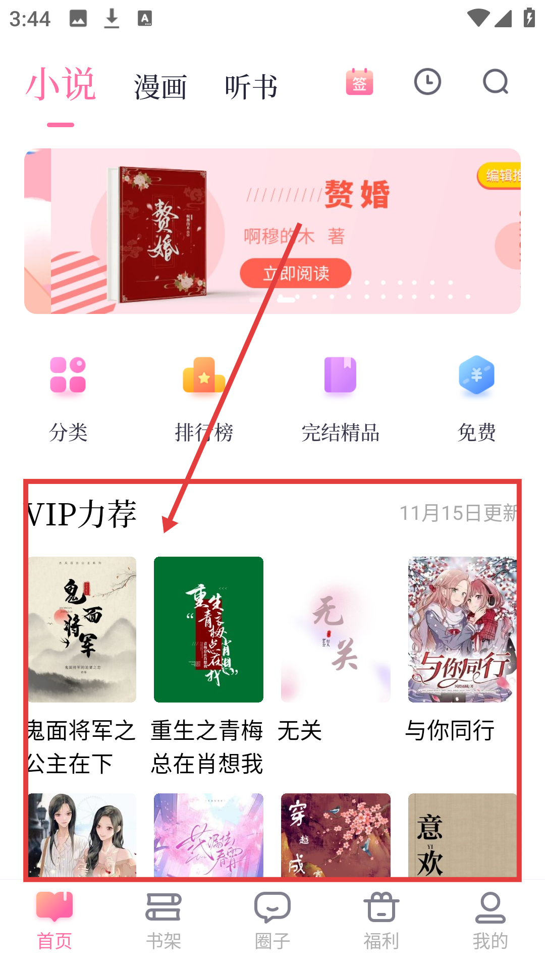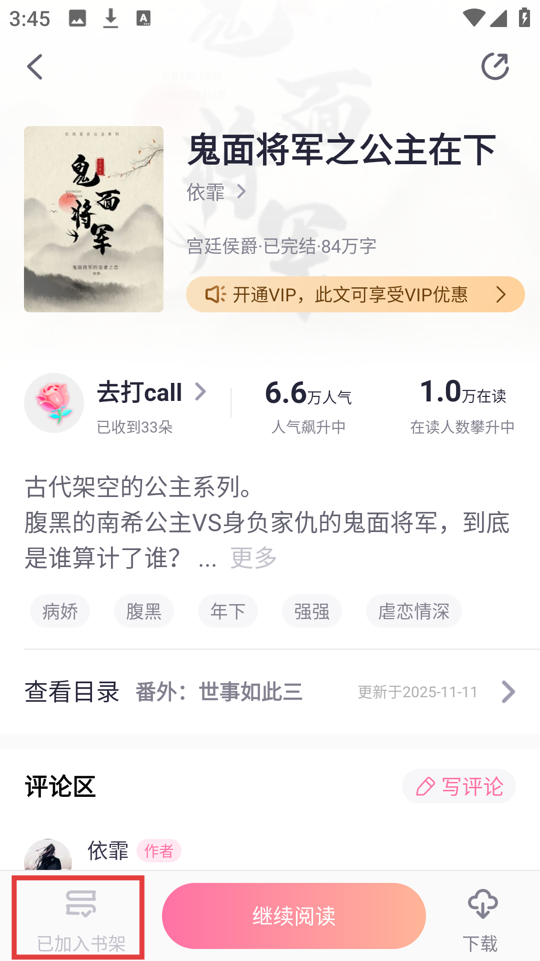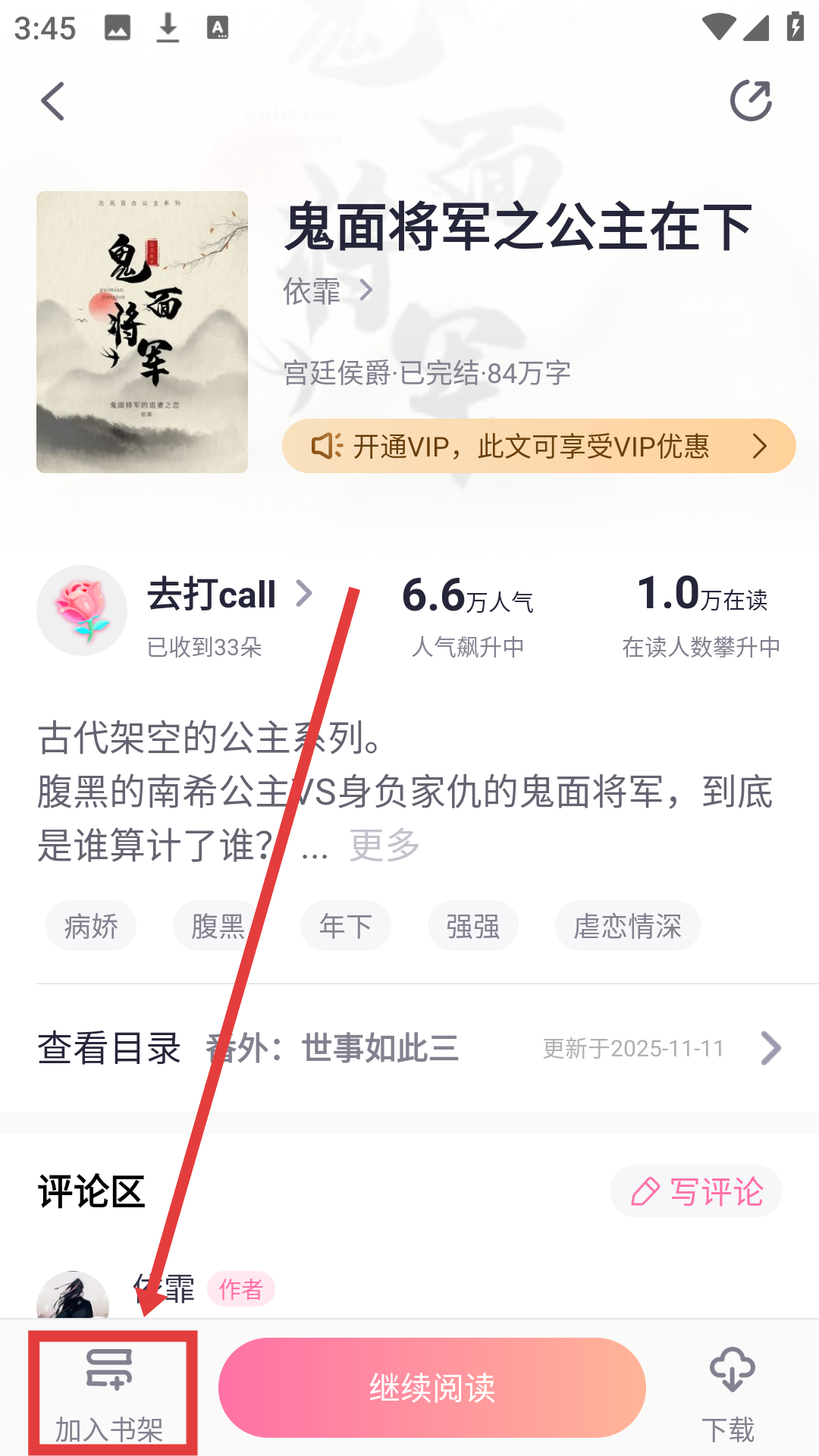 1、在首页“VIP力荐”选喜欢的小说,如【鬼面将军之公主在下】,进入书籍详情界面哦。