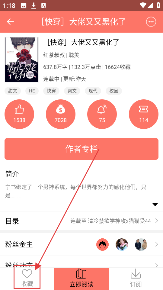 2、小说详情页点【收藏】,就能把小说加入收藏夹,方便后续查看哦。