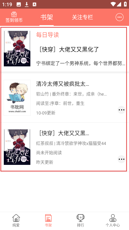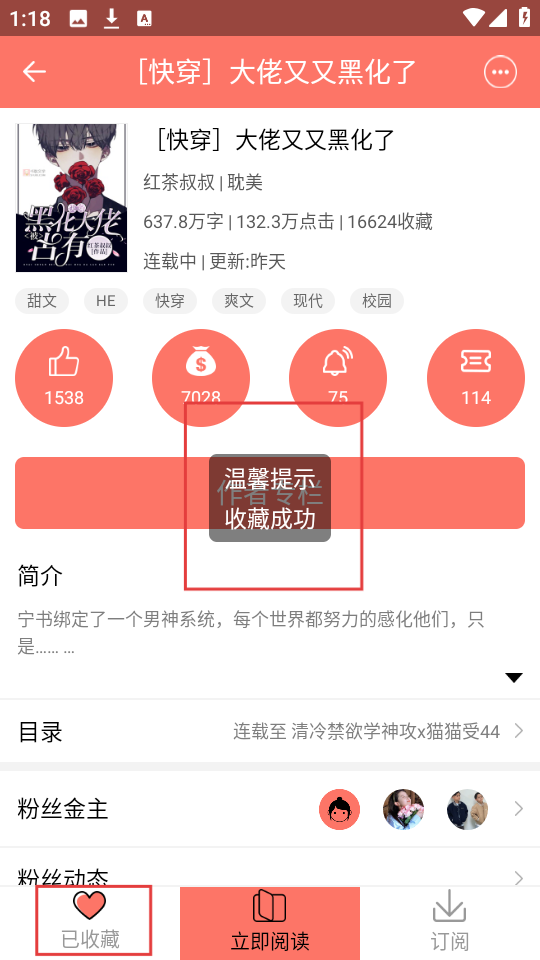 4、去书架看看,能找到刚收藏的【[快穿]大佬又又黑化了】,随时可以阅读呀。
