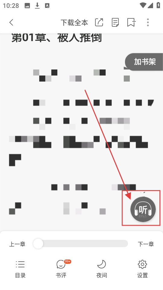 2、在小说阅读页面,点击右下角【听】按钮,进入听书模式,可开始听小说内容哦。