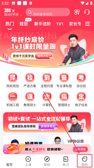 1、在考研备考平台首页,点击底部的【我的】选项,就能进入个人中心页面查看各类功能啦。
