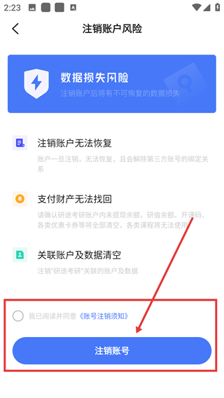 4、进入注销账户风险页后,勾选同意须知再点击【注销账号】,就能提交账户注销的申请啦。