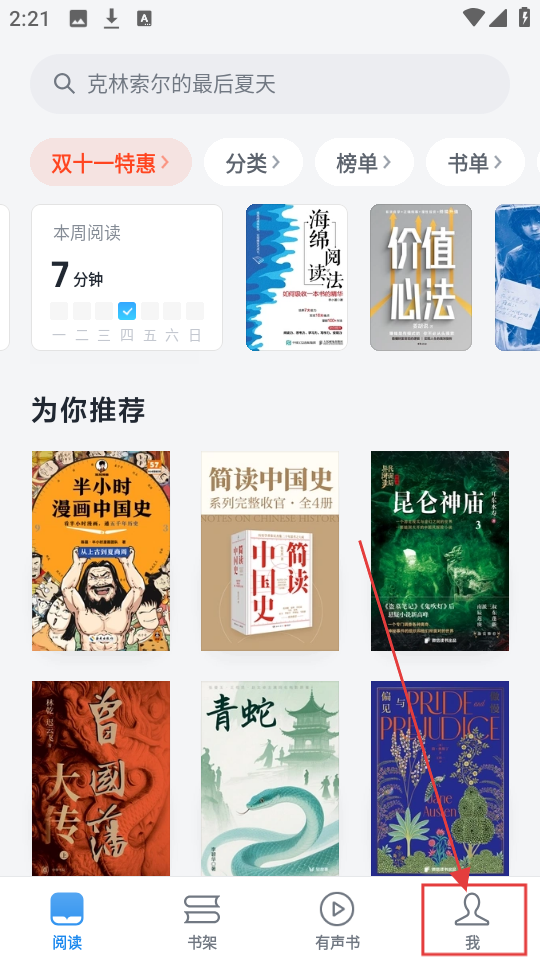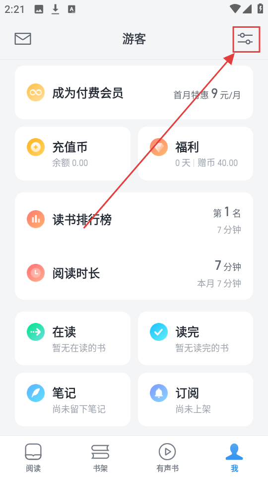 1、阅读页点【我】,进入个人中心,可查看个人阅读数据和功能选项哦。
