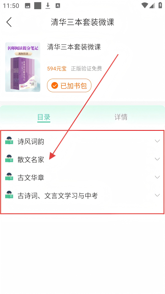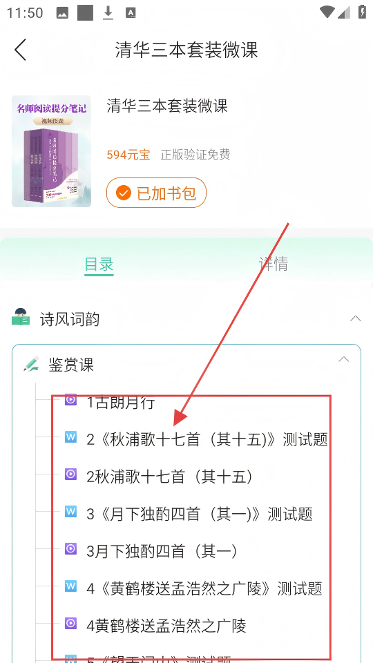 2、进入【清华三本套装微课】页面,能看到课程目录,像【诗风词韵】等板块都有,按需学习哦。