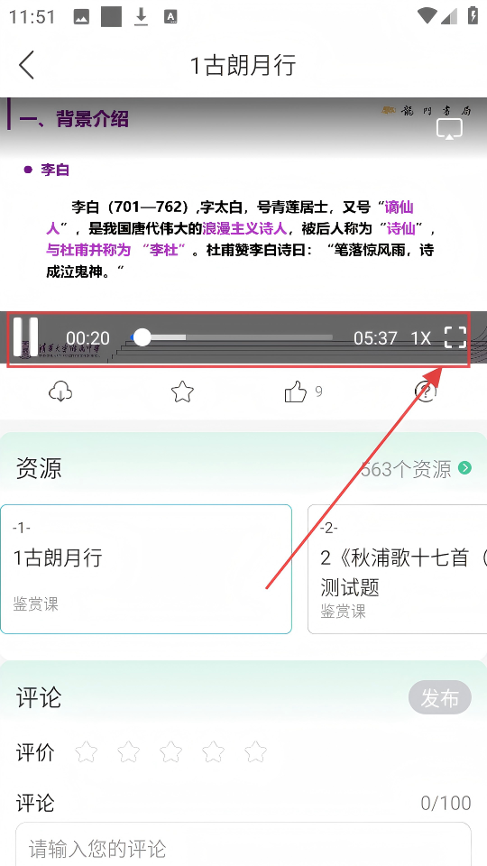 4、点击进入《古朗月行》课程,能听音频学习背景介绍等内容,还能调整播放速度,很实用的。