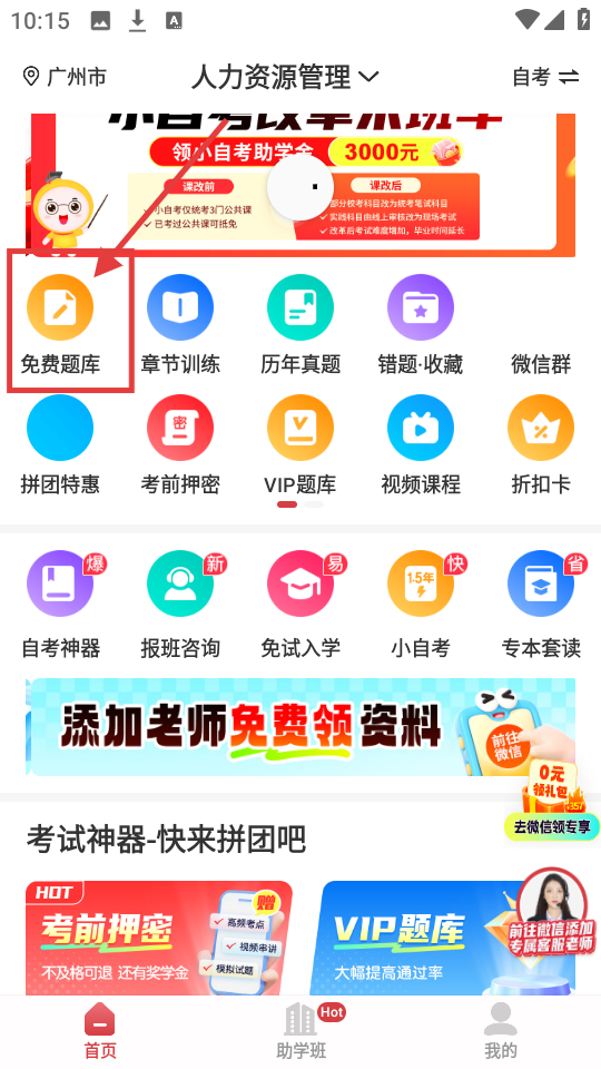 1、首页有免费题库、章节训练等功能,想刷题就点【免费题库】,超方便。