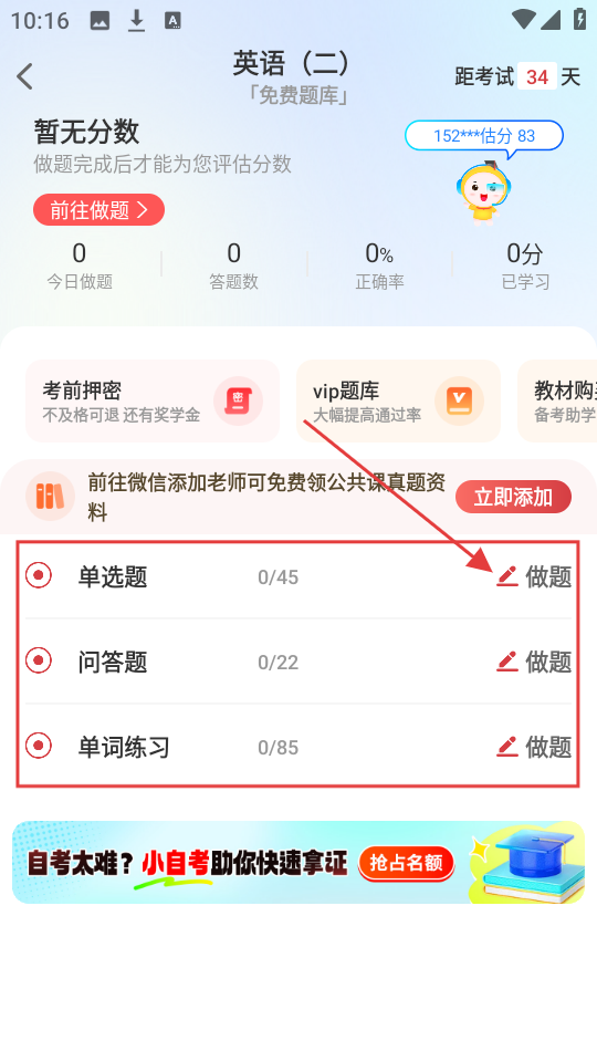 3、英语(二)题库有单选题、问答题等题型,点【做题】,就能开始刷题。