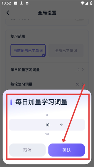 4、在弹出的词量选择窗口中,选好目标数量后点击【确认】,即可完成每日加量学习词量的设置哦。
