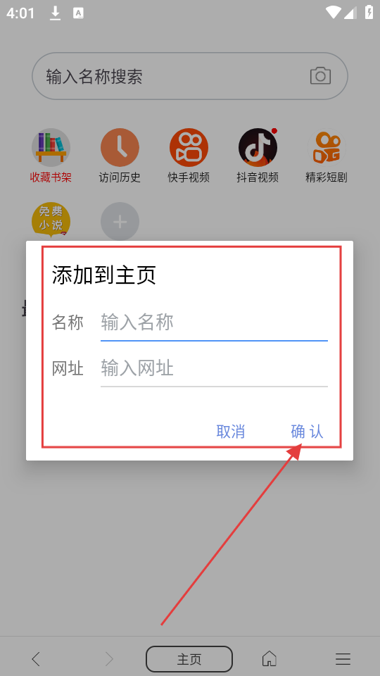2、在添加窗口,输入名称和网址,点击【确认】,就能尝试添加操作哦。