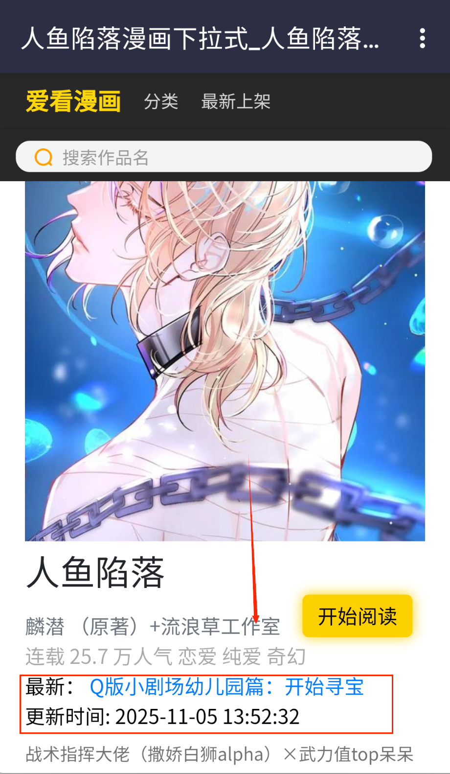 2、爱看漫画免费版加入收藏后,可以及时推送消息,然后点击按钮直接进入最新更新的剧集。