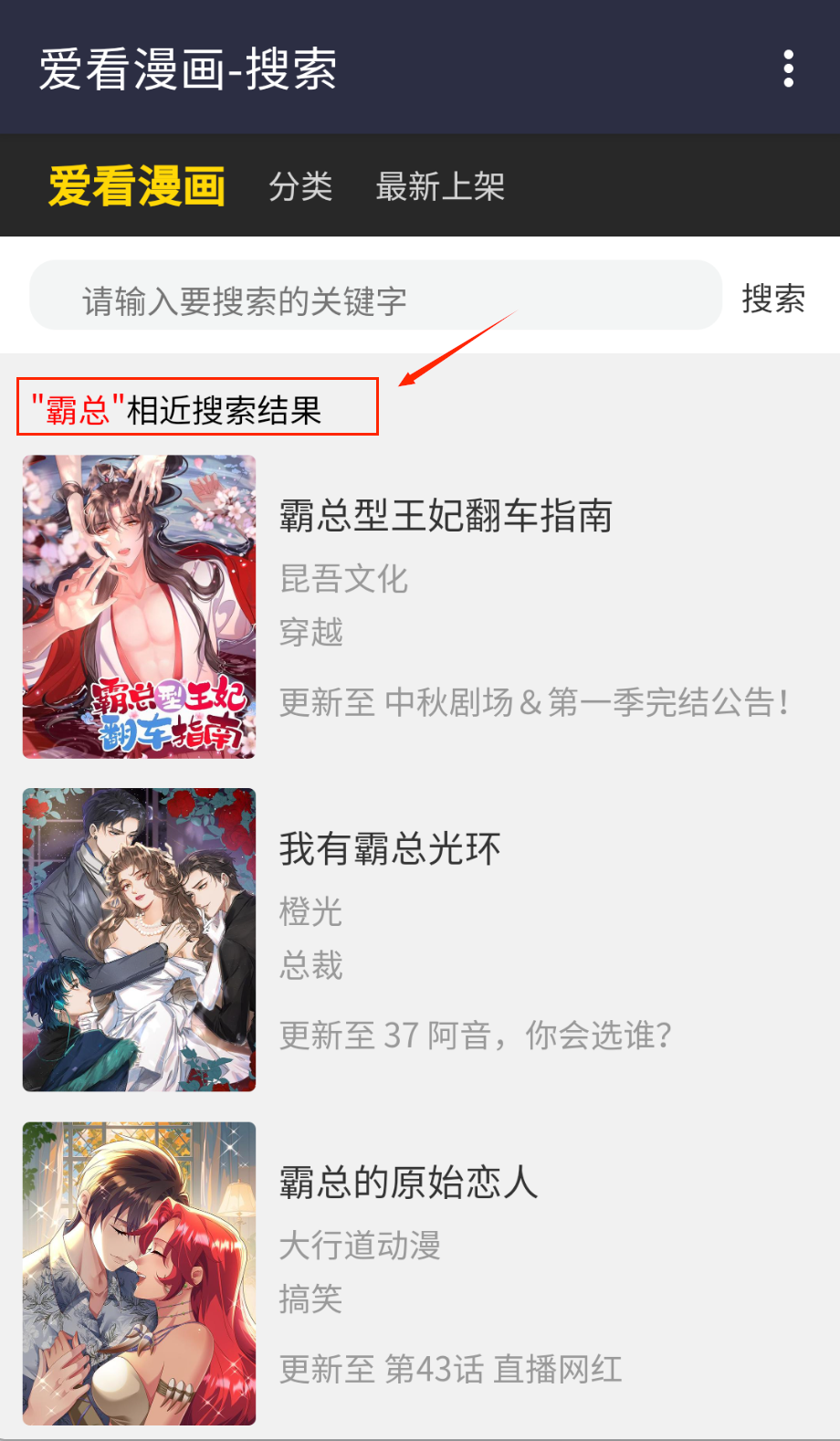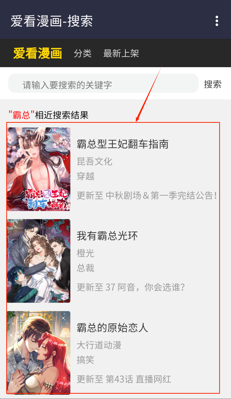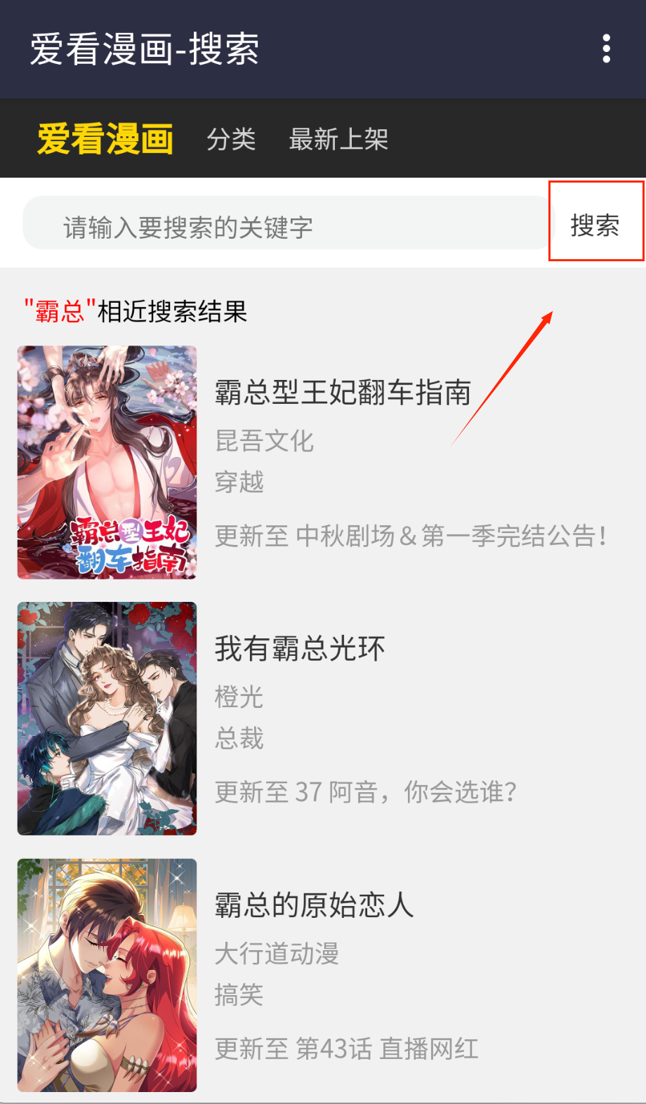 2、漫画搜索你喜欢的漫画内容,选择重点,找到你喜欢的漫画尽情观看。