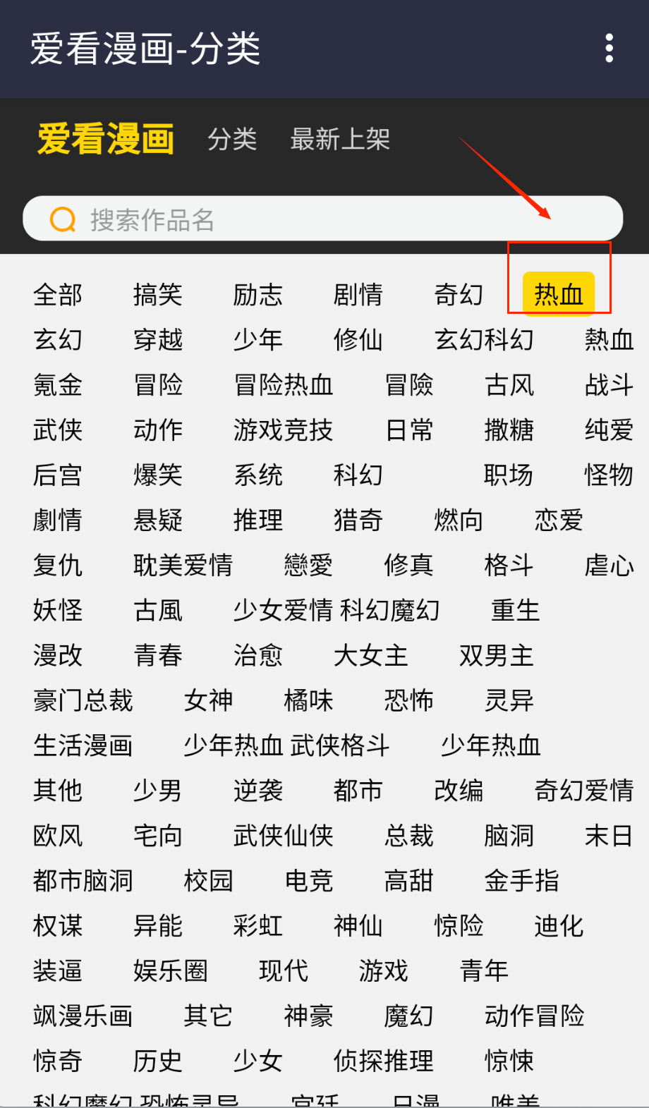 2、点击具体分类如"热血"后,会进入该分类作品列表,作品按人气值排序,优质作品会优先展示。