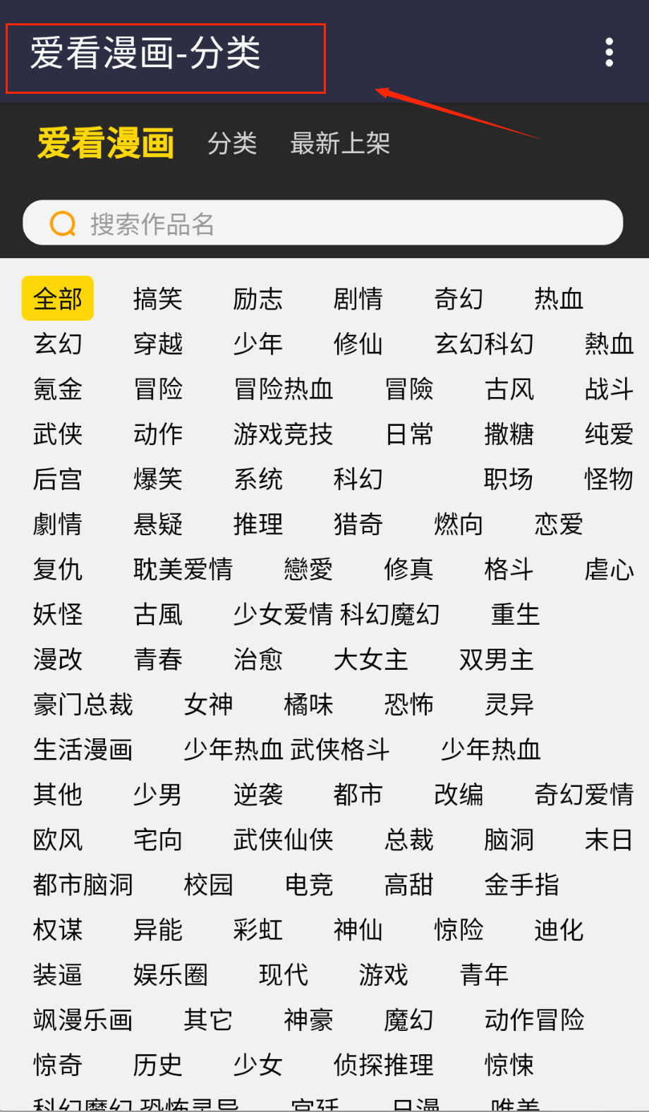 1、打开软件后首先看到顶部导航栏有爱看漫画、分类、最新上架三个选项,点击分类进入漫画分类页面。