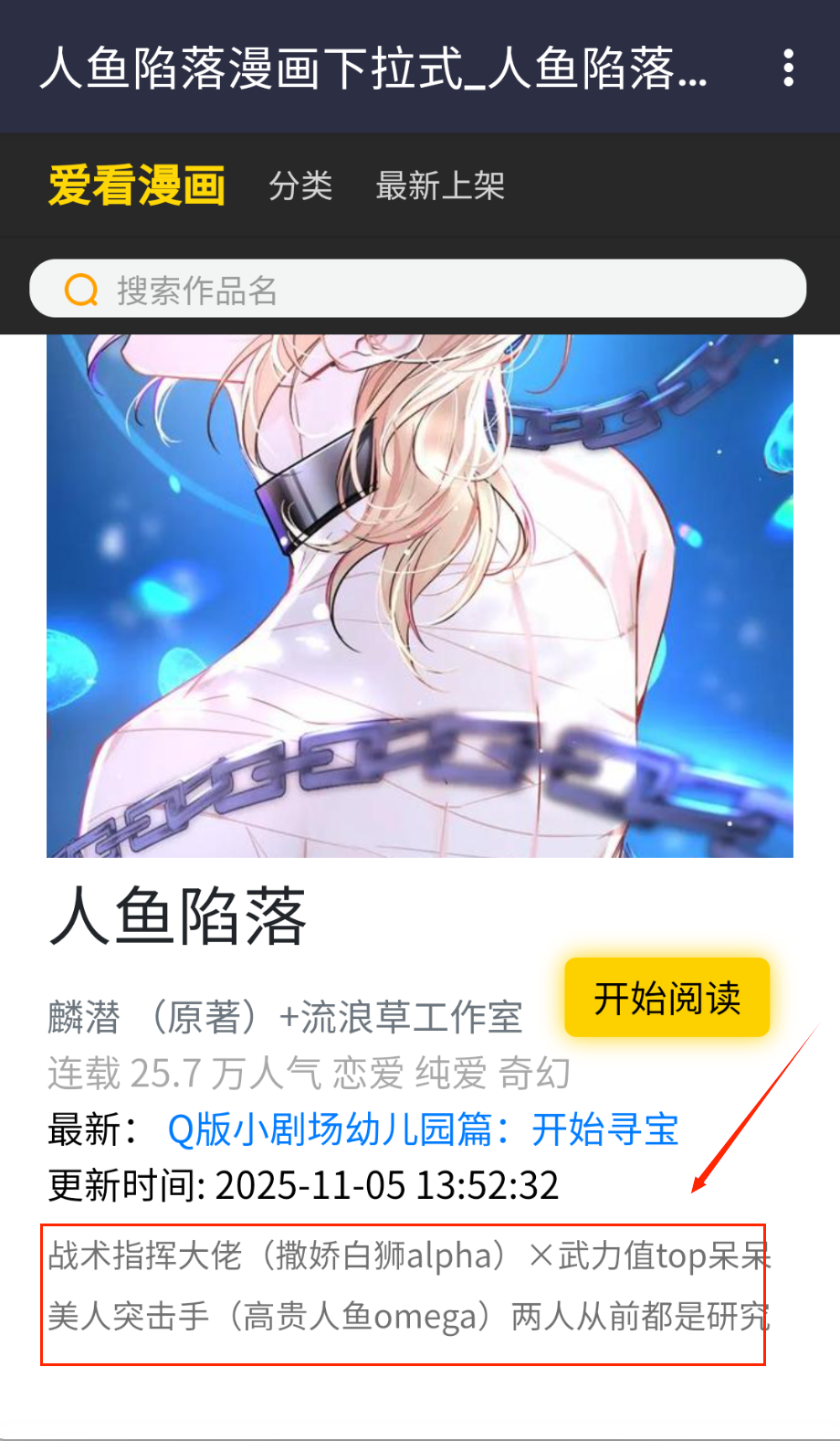 3、作品详情页展示完整信息包括作品来源、连载状态、人气值、简介和章节目录,最新更新章节会突出显示更新时间。
