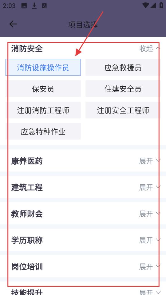 1、在项目选择界面,找到【消防安全】分类下的【消防设施操作员】选项,点击它进入相关页面。