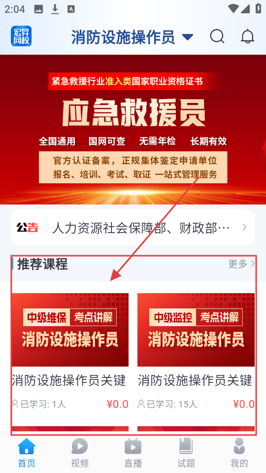 2、进入后,在推荐课程区域,能看到【中级维保考点讲解消防设施操作员】等课程,选择想学习的课程。