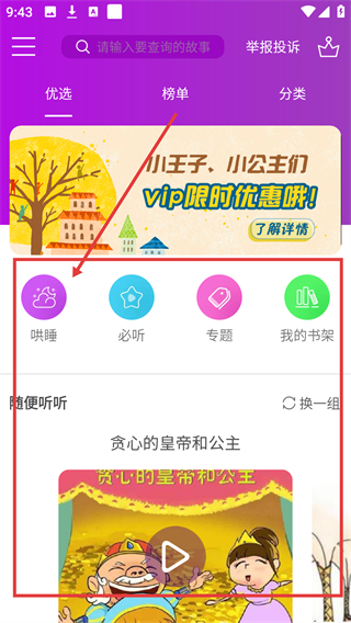 1、在APP首页,点击【哄睡】选项,进入哄睡故事的播放界面,可收听助眠类故事内容啦。