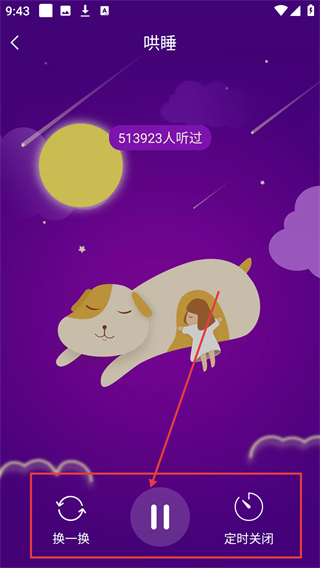2、进入哄睡播放页后,可通过【换一换】切换故事,用【定时关闭】设置播放时长,按需调整收听节奏哦。