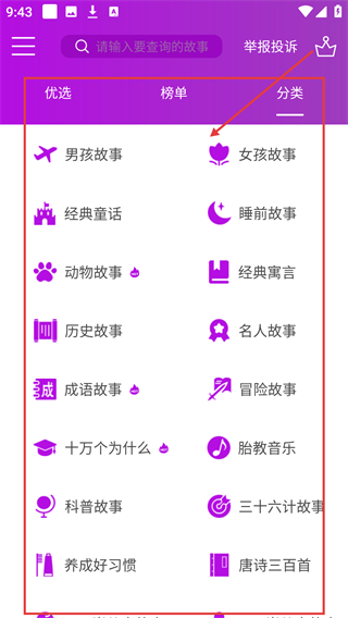 3、返回首页点击【分类】,在分类列表中选择【睡前故事】类别,即可筛选出对应类型的故事内容呀。