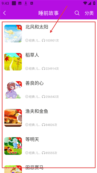 4、进入睡前故事列表页,选择心仪的故事(如【北风和太阳】),点击即可进入该故事的播放界面啦。