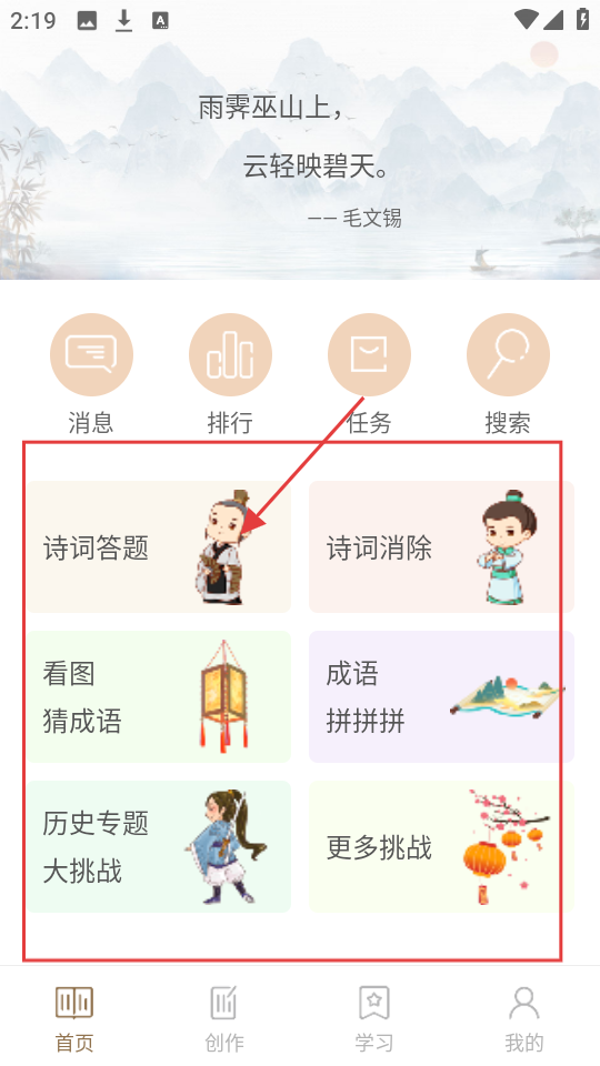 1、在首页,有【诗词答题】【诗词消除】等多种游戏,选【诗词答题】,开启答题之旅,超有趣的。
