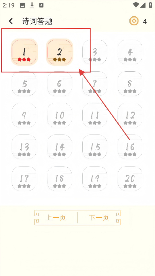 2、进入【诗词答题】,能看到多道题目,选已解锁的,像标有星星的,就可以开始答题啦。