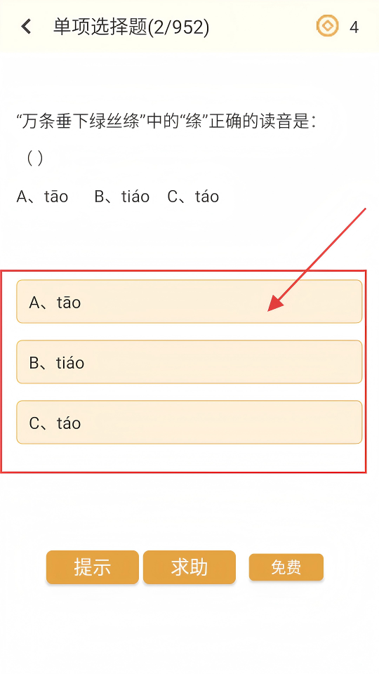3、答题时,仔细看题目,比如“万条垂下绿丝绦”中“绦”的读音,选正确选项。