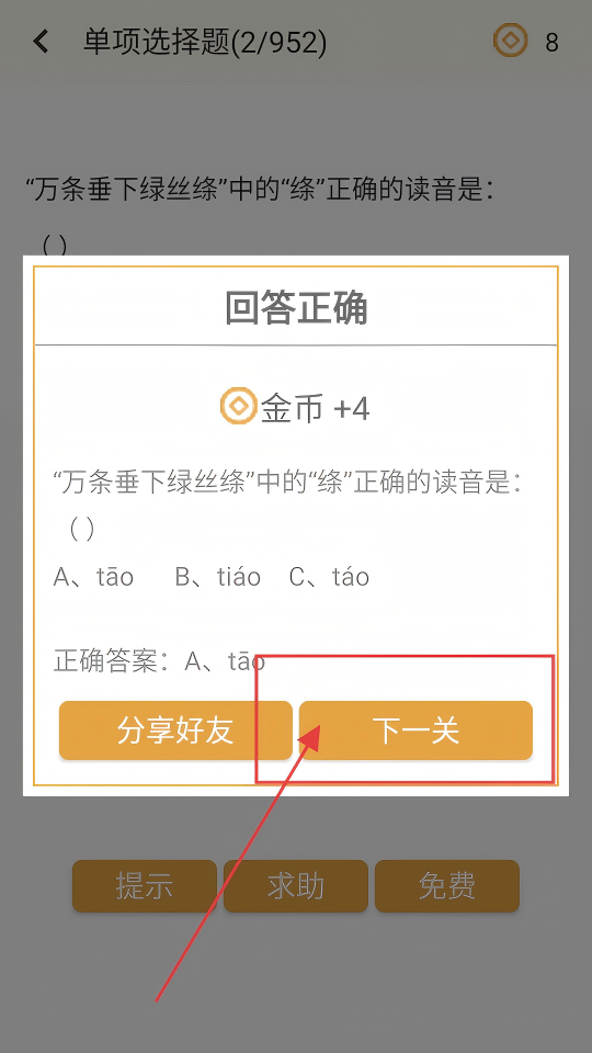 4、答对题后,会获得金币奖励,还能点击【下一关】继续挑战哦。