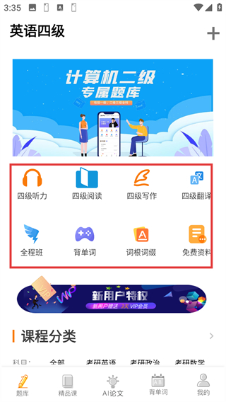 1、在英语四级学习APP的题库页面,点击【四级听力】选项,可进入听力专项练习的题库列表啦。