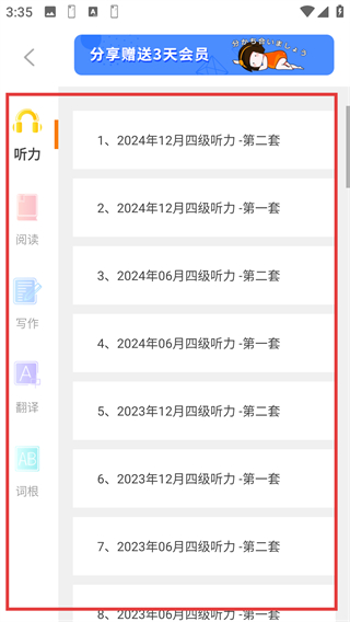2、进入听力题库列表后,选择对应考试时间的听力套题(如2024年12月第二套),进入该套题的练习界面哦。