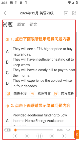 3、在听力套题练习页,可点击音频控制按钮调整播放速度,还能查看试题选项,同步进行听力答题训练啦。