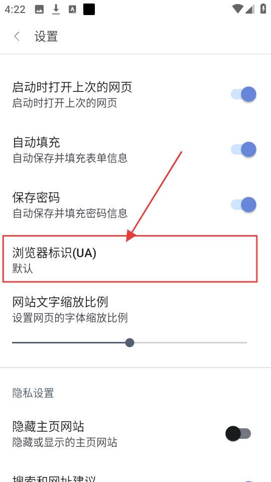 3、在设置页面,点击【浏览器标识(UA)】选项,弹出浏览器标识选择弹窗,可选择不同标识呢。