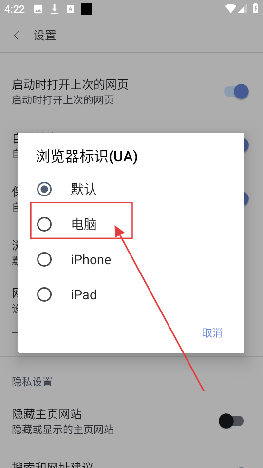4、在浏览器标识选择弹窗中,选择【电脑】选项,即可将浏览器标识设置为电脑模式,方便浏览对应网页啦。