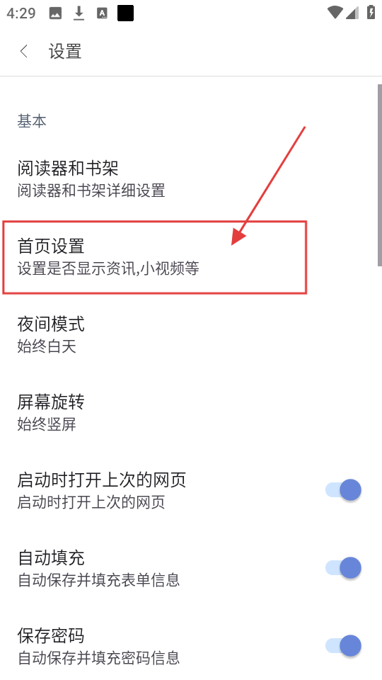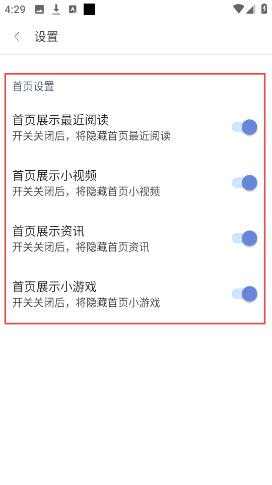 4、在首页设置页面,可对首页展示的内容,如最近阅读、小视频等进行开关设置。