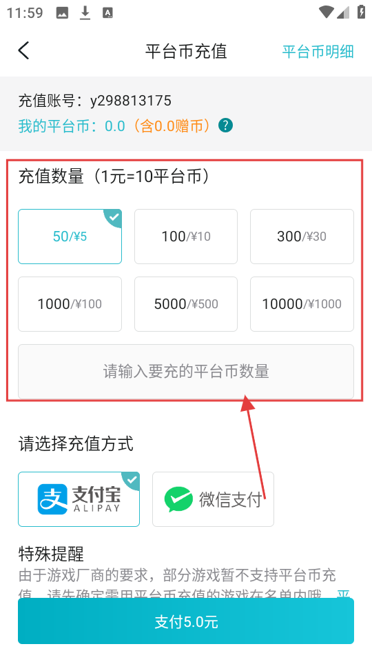 3、在平台币充值页面,选择想要充值的平台币数量,也可手动输入充值数量,灵活选择充值金额呢。