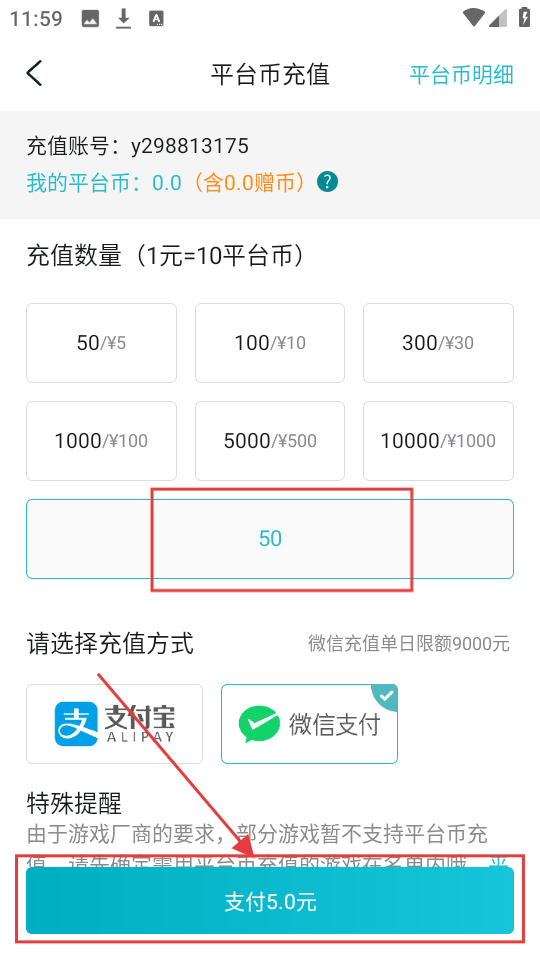 4、选好充值数量后,选择支付方式,如支付宝或微信支付,然后点击支付按钮,完成平台币充值啦。