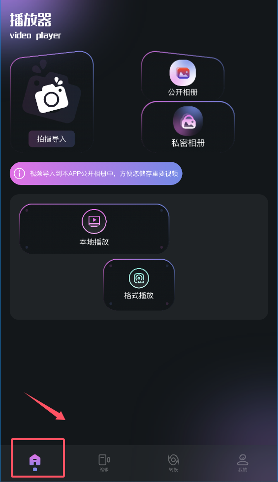 1、首页聚焦视频的导入与播放,使用“拍摄导入”功能,选择“公开相册”或“私密相册”存储,然后通过“本地播放”或“格式播放”即可观看。