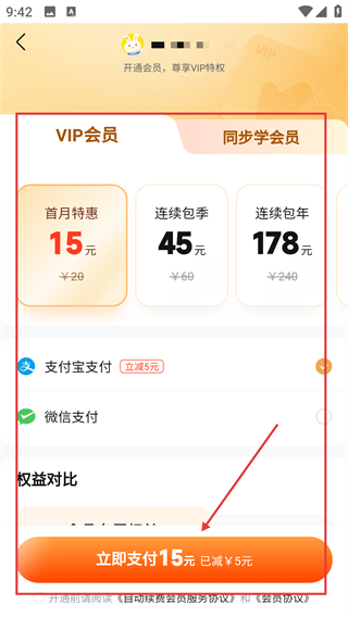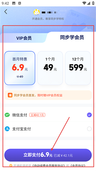 4、切换到【同步学会员】标签,能看到对应套餐价格,选好后点支付按钮即可开通该会员哦。