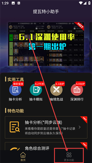 1、在提瓦特小助手指页点击【更多功能】选项,就能进入功能扩展页面,查看更多实用的游戏辅助功能啦。