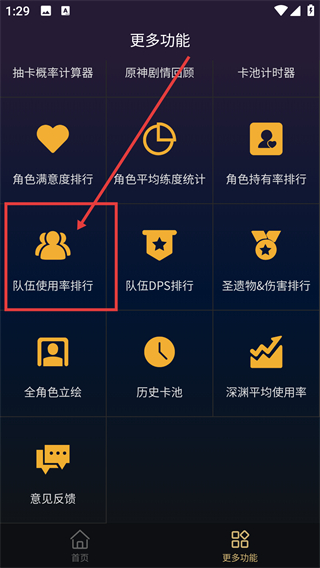 2、进入更多功能页后,点击【队伍使用率排行】选项,就能查看当前版本各队伍的深渊使用情况啦。