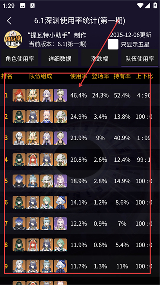 3、进入6.1深渊使用率统计页后,切换到【队伍使用率】标签,就能看到各队伍的具体使用率排名数据哦。