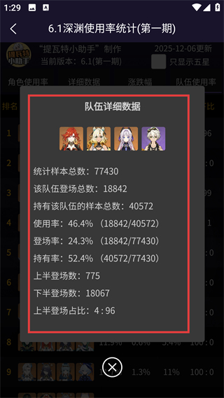 4、点击某支队伍的条目,就能弹出【队伍详细数据】窗口,查看该队伍的登场率、持有率等详细信息啦。