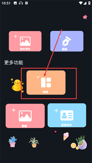 1、在功能页点【拼图】选项,能进入拼图编辑界面,后续可选择图片进行拼接排版啦。